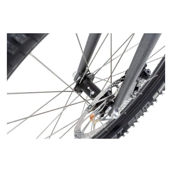 Basierend auf dem Wissen erfahrener Musher haben wir uns für eine feste Gabel entschieden - so entsteht kein Energieverlust wie bei einer gefederten Gabel. Neben der präzisen Steuerung trägt die halbintegrierte Kopfbaugruppe auch zur Gesamtfestigkeit des Tretrollers bei. Dank einer anderen, optional mitgelieferten Unterlegscheibe kann die Standard-Stahlgabel beispielsweise durch eine Carbon-Gabel mit konischem Vorbau (tapered) ersetzt werden.