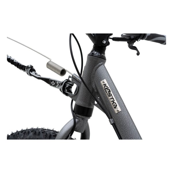Der Kostka Mushing Racer Max (G6) ist ein Tretroller, der von Grund auf für schnelles Fahren auf unbefestigten Wegen entwickelt wurde, egal ob Sie mit einem Hund oder alleine fahren (was natürlich nicht ausgeschlossen ist). Die Basis sind große Räder mit hervorragendem Offroad-Handling - 27,5 Zoll vorne, 24 Zoll hinten - sowie ein Rahmen mit einer Geometrie, die speziell für schnelles Fahren im Terrain entwickelt wurde. Der Rahmen der sechsten Generation, der an einem Roboterarbeitsplatz mit hoher Präzision und Schweißqualität geschweißt wird, ist aufgrund des harten Fahrverhaltens für die härtesten Bedingungen verstärkt und verfügt im Gegensatz zu Straßenmodellen über eine erhöhte Tretfläche, um die Überwindung von unebenem Gelände zu erleichtern. Darüber hinaus verfügt er über einen neuen CNC-gefrästen Aluminium-Fersenschutz. Zusätzlich kann die Höhe (und Neigung) der Tretfläche mit speziell entwickelten Abstandshaltern der Vordergabelkopfbaugruppe in einem Bereich von ± 30 mm eingestellt werden.