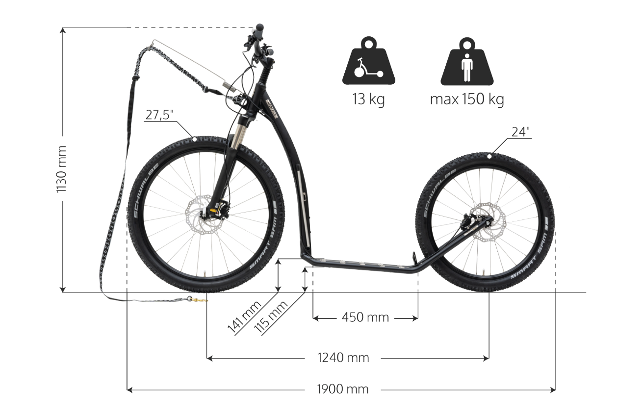 Tretroller mit gefederter Vorderradgabel, die mit einer Hundeleine ausgestattet sind, produzieren wir seit langem. Das neue Modell KOSTKA MUSHING RACER PRO (G6) bringt das Offroad-Erlebnis jedoch noch eine Stufe höher. Da die großen Räder schneller fahren und gleichzeitig ein besseres Handling im Gelände haben, haben wir dieses Modell mit 27,5 " Rad vorne und 24" Rad hinten ausgestattet. Unebenheiten, über die Sie bisher vorsichtig und langsam fuhren, schaffen Sie nun mit voller Geschwindigkeit zu überwinden. Je nach Fahrbahnbeschaffenheit wählen Sie bei Schwalbe Smart Sam Offroad-Reifen einfach den optimalen Luftdruck. Dafür werden Sie mit toller Traktion in Synergie mit geringem Rollwiderstand belohnt. Hydraulische Scheibenbremsen von Shimano Deore sorgen dann auch unter den anspruchsvollsten Bedingungen für sicheres Bremsen oder Anhalten. Sie werden sowohl auf trockenem als auch im schlammigen oder nassem Gelände buchstäblich festgehalten.